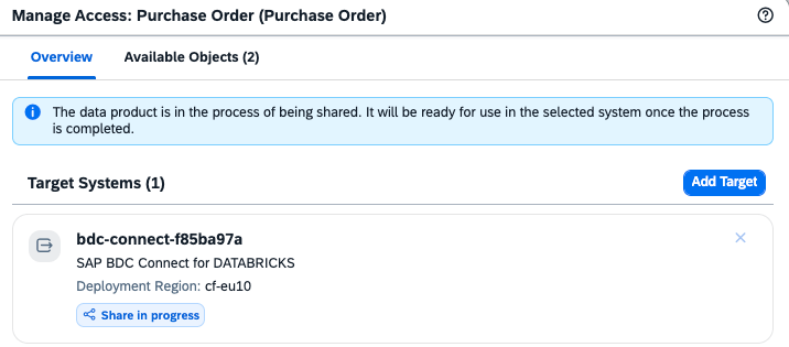 Sharing the Data Product to Enterprise Databricks is via the share button. I have already added the BDC Partner Connector for the DataBricks instance (seperate to this doco)