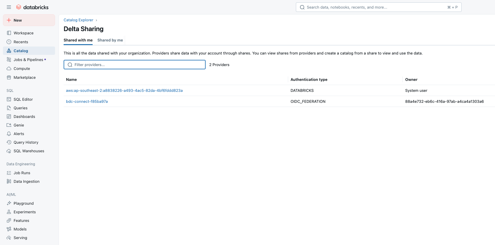 Within the Databricks environment, accessing the Catalog Explorer and the BDC Connect provider: