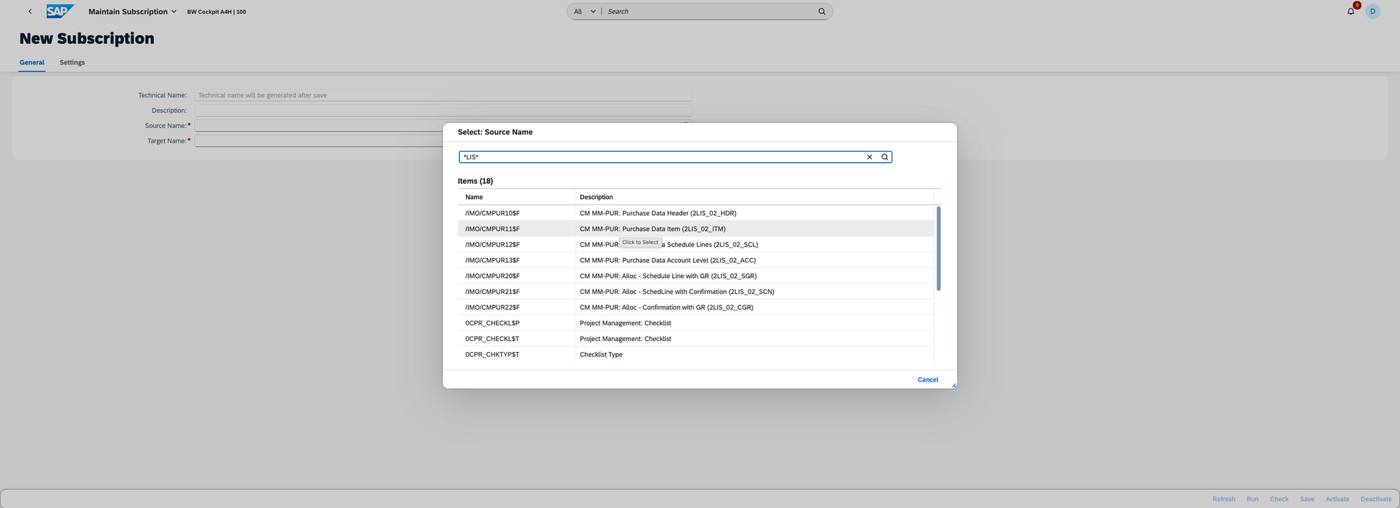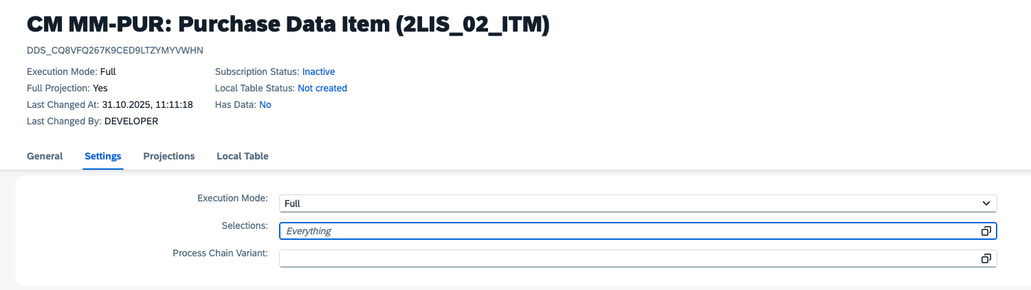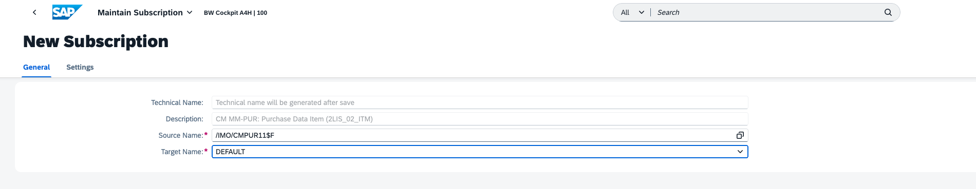 - Settings : Allows Full or Delta execution mode, apply filters to the data extraction and add Process Chain Variants to the subscription.