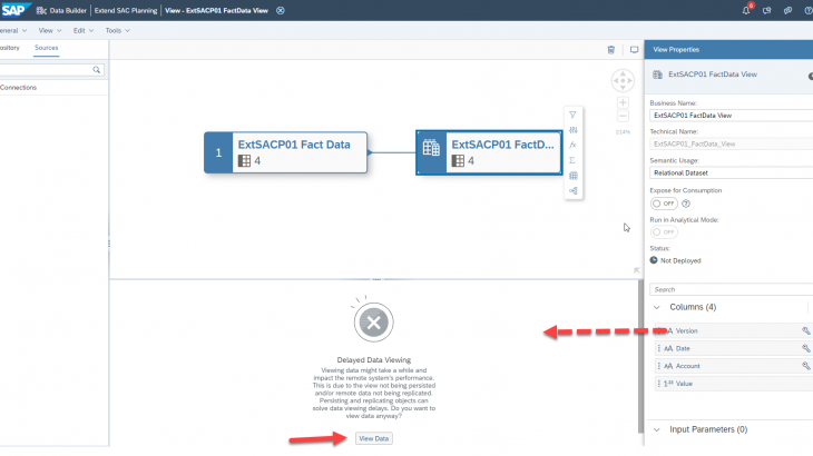 - the name of the view we created earlier – ‘ExtSACP01_FactData_View’